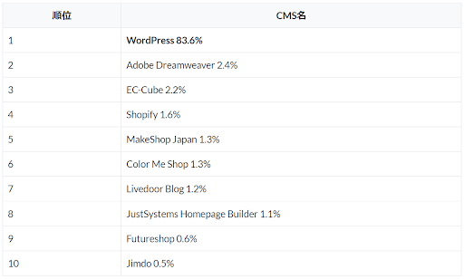 また、その手軽さと品質の高さから、CMSで作成されたサイトに絞ると、世界で60%以上、日本ではなんと80%以上のシェアを誇っているのも大きな特徴です。