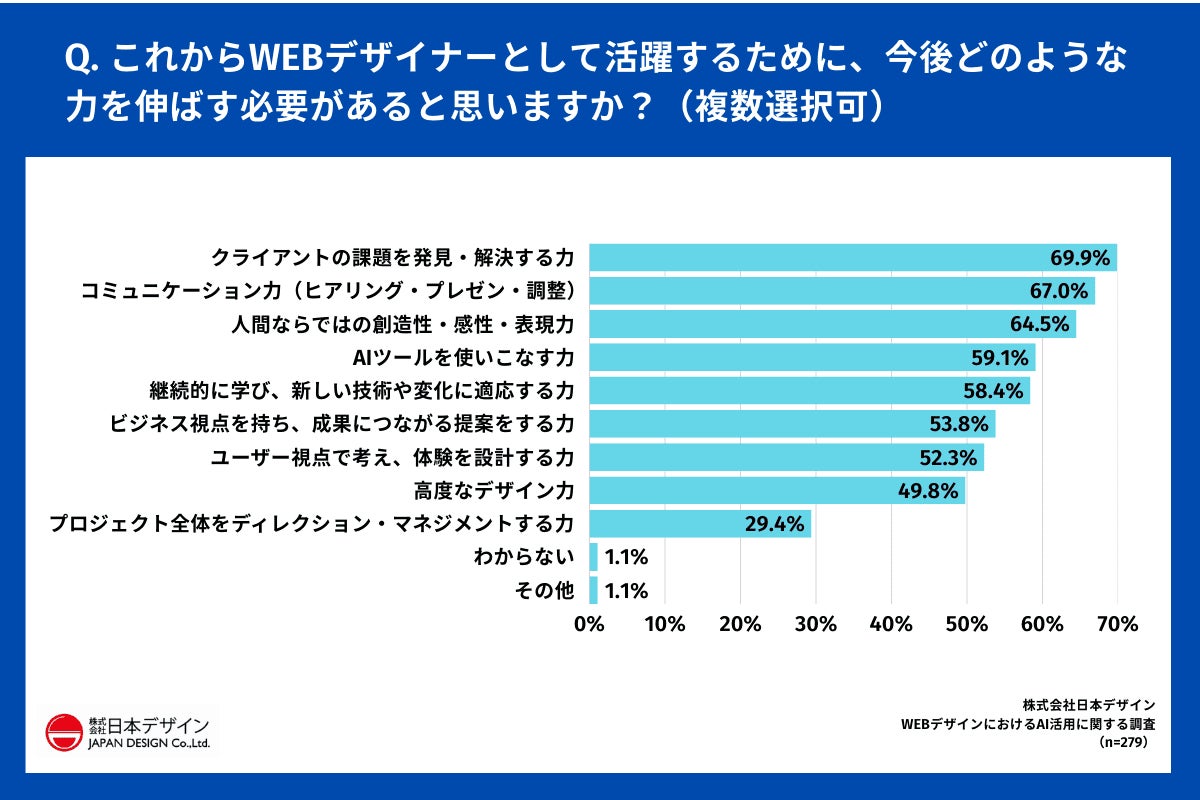 「Q.これからWEBデザイナーとして活躍するために、今後どのような力を伸ばす必要があると思いますか?(複数選択可)」(n=279)と質問したところ、「クライアントの課題を発見・解決する力」が69.9%で最多となりました。