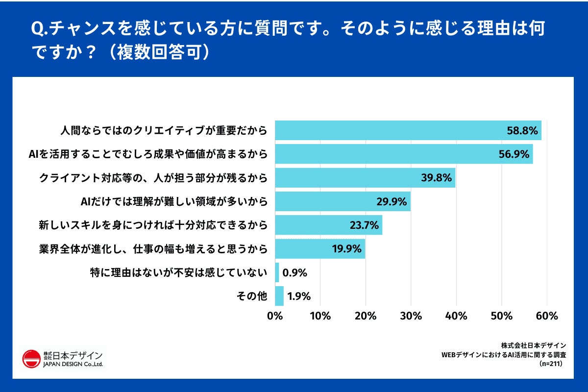 チャンスと感じている方に「Q.そのように感じる理由は何ですか?(複数回答可)」(n=211)と質問したところ、「人間ならではのクリエイティブが重要だから」が58.8%で最多となりました。