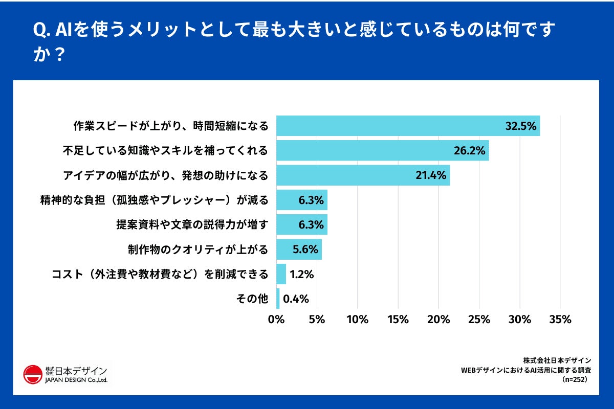 「Q.AIを使うメリットとして最も大きいと感じているものは何ですか?(単一選択)」(n=252)と質問したところ、「作業スピードが上がり、時間短縮になる」が32.5%で最多となりました。