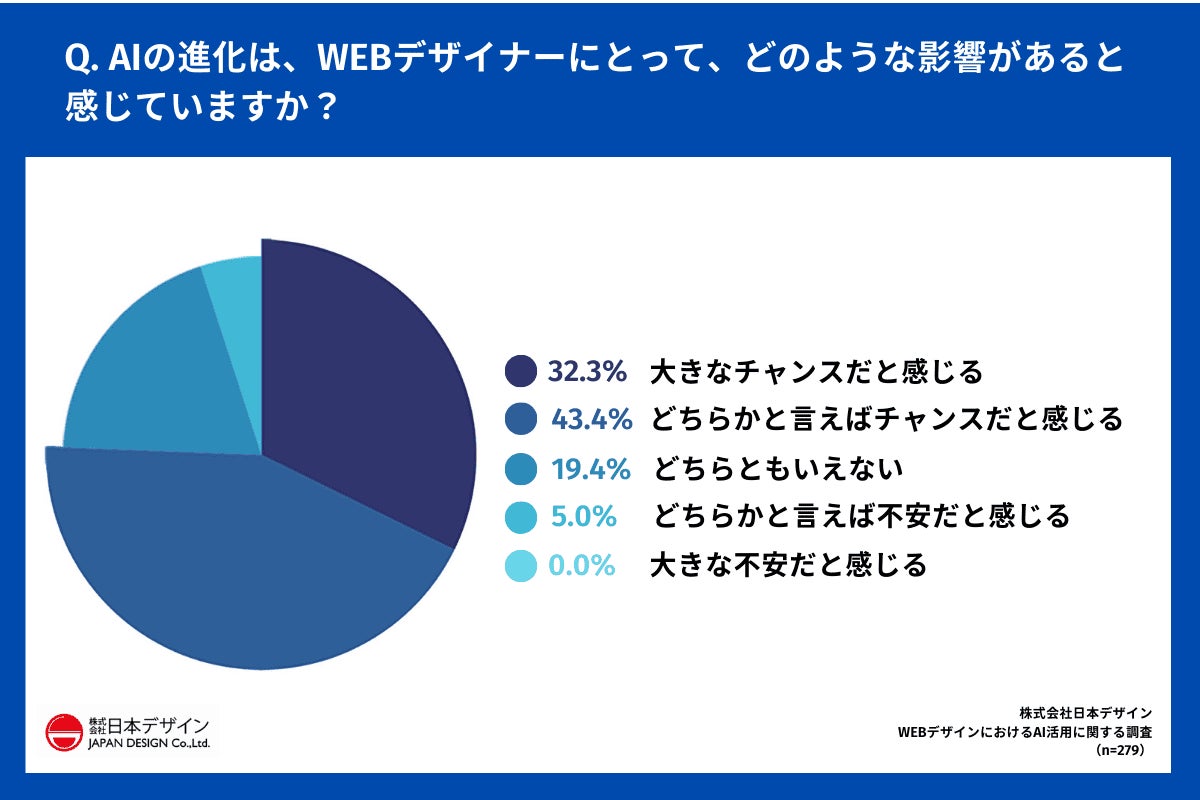 「Q.AIの進化は、WEBデザイナーにとって、どのような影響があると感じていますか?」(n=279)と質問したところ、「大きなチャンス(追い風)だと感じる」が32.3%、「どちらかと言えばチャンスだと感じる」が43.4%となり、合わせて約75%がチャンスと捉えていることがわかりました。