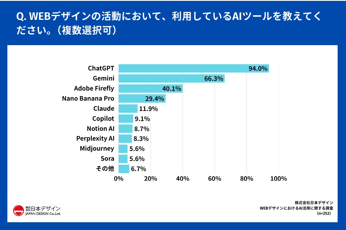「Q.WEBデザインの活動において、利用しているAIツールを教えてください。(複数選択可)」(n=252)と質問したところ、「ChatGPT」が94.0%で圧倒的多数となりました。
