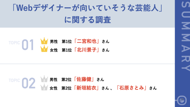 "【Webデザイナーが向いていそうな芸能人】男性部門第1位「二宮和也さん」女性部門第1位「北川景子さん」" の続きを読む