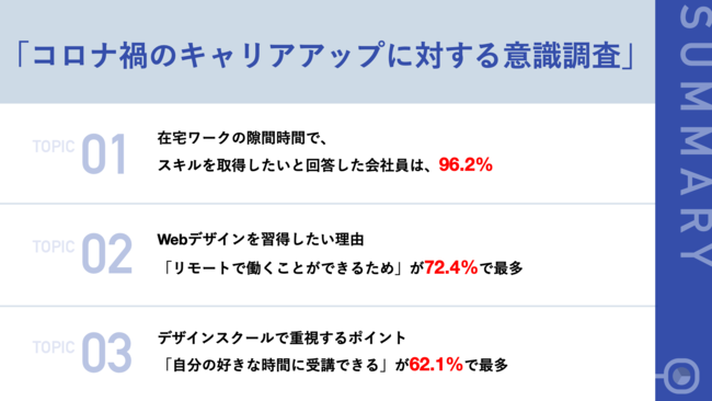 "在宅ワークでキャリアップに不安を抱える会社員の約8割が「転職」を検討 約3割が「在宅のうちにWebデザインスキルを身につけたい」" の続きを読む